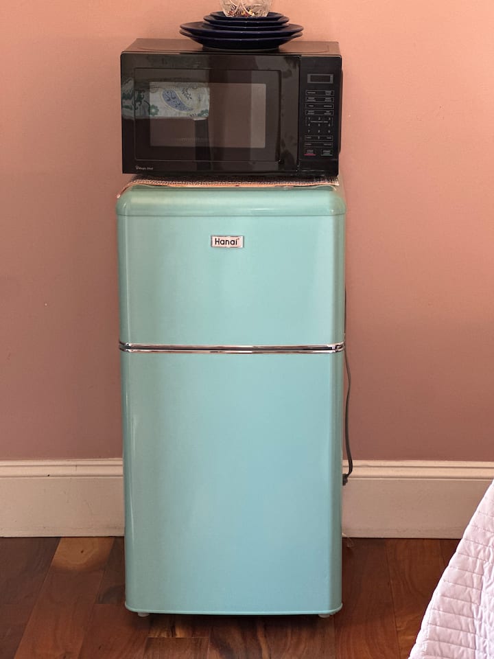 To enhance your experience, each room is equipped with a small refrigerator, microwave, hot pot, and Keurig coffee machine, along with a small set of dishes for your convenience.