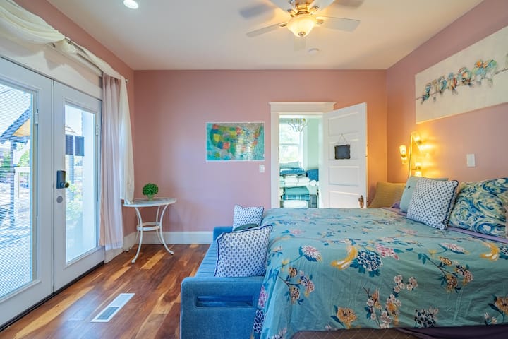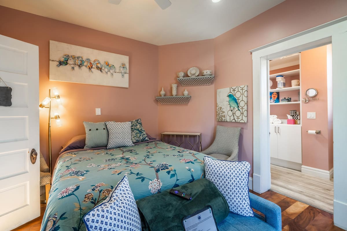 Set within a tranquil desert and botanical garden, our beautifully designed Airbnb spaces reflect a magical Alice in Wonderland-inspired vibe crafted by Twila Abrams, the owner. Our charming 1910 home boasts six unique rooms, each thoughtfully designed for comfort and infused with whimsical touches. Enjoy ample parking, including spaces for vehicles towing trailers, so you can explore the area with ease.