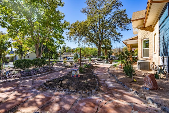Welcome to Blooming Heart Village, your zen retreat in downtown St. George! Our beautifully appointed master suite invites you to relax and unwind, surrounded by charming exterior grounds that offer multiple cozy spots to soak in the abundant beauty. Enjoy a delightful putting green and inviting picnic areas right on the front lawn, perfect for leisurely afternoons. As you explore the property, you’ll also discover five soothing fountains, creating a serene ambiance that enhances your experience. Here, you can mingle with fellow sightseers and globetrotting guests from our five additional rooms, fostering a wonderful sense of community during your stay.