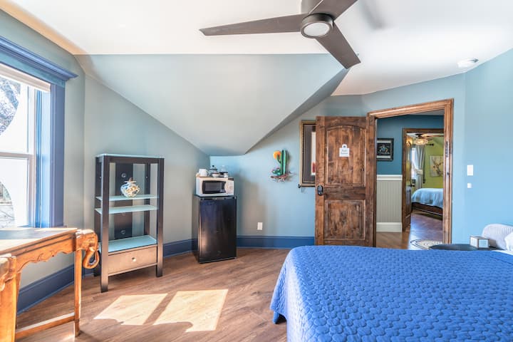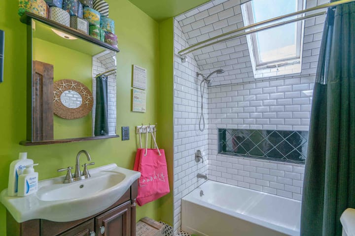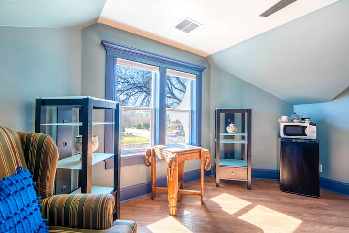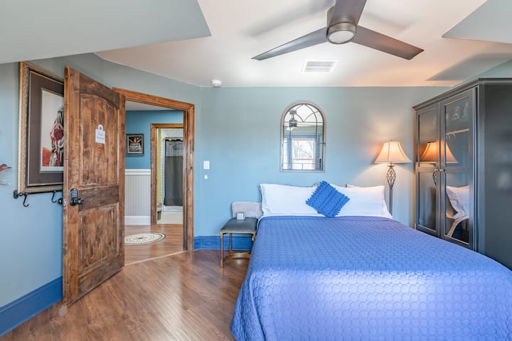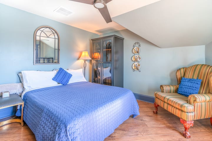 Sweet upstairs bedroom with tons of charm and light! Comfy queen bed and a perfect space for budget vacationing or busy travelers needed a quick stop to rest. Shopping and restaurants found in city center, 2-3 blocks away.